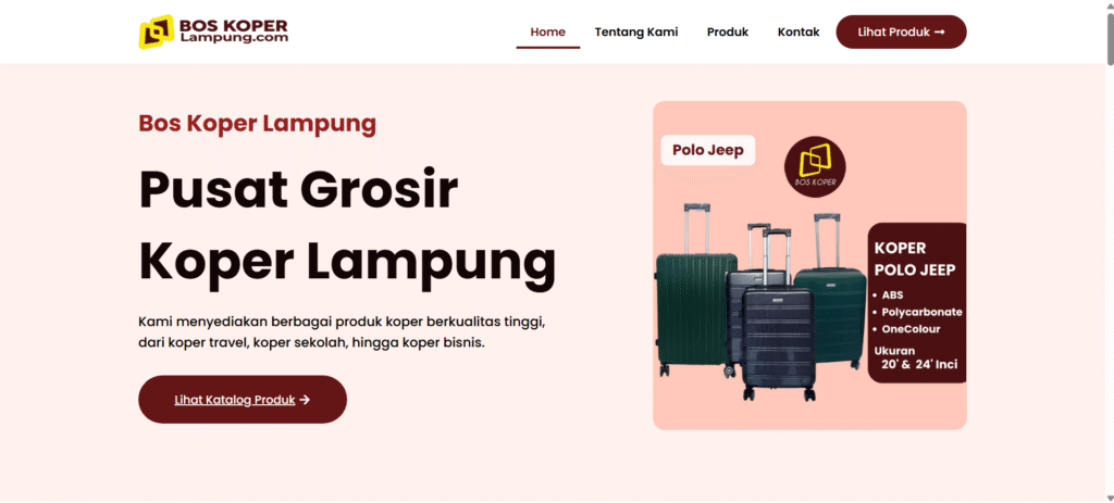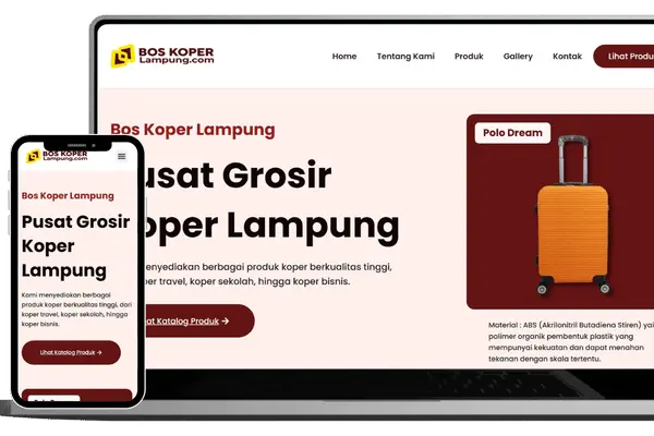 Bos Koper Lampung adalah pusat grosir koper terbesar dan terpercaya di Lampung yang melayani penjualan eceran maupun grosir. Kami dipercaya untuk membangun website toko online modern yang mampu menampilkan katalog produk secara rapi, profesional, dan terintegrasi dengan WhatsApp untuk memudahkan proses transaksi langsung.