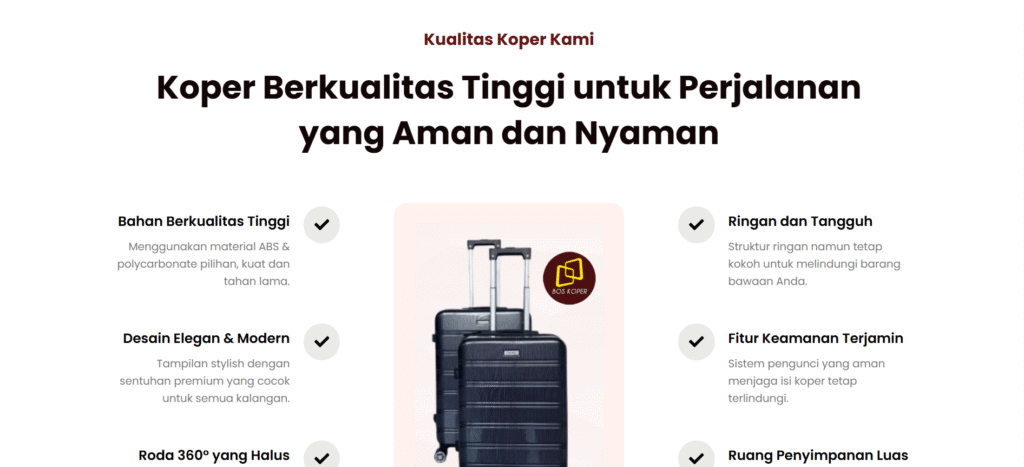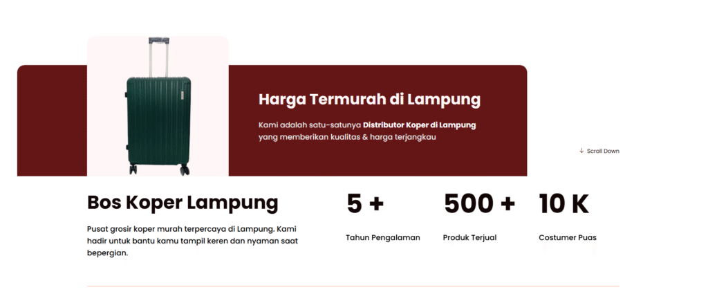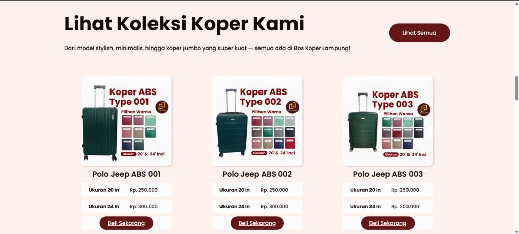 Sejak website diluncurkan, Bos Koper Lampung mulai mendapatkan lebih banyak pertanyaan dan pemesanan dari luar kota, terutama melalui WhatsApp. Dengan adanya katalog yang tertata dan mudah diakses, calon pelanggan dapat memilih produk tanpa harus bertanya satu per satu di chat. Branding usaha juga jadi terlihat lebih profesional dan terpercaya.